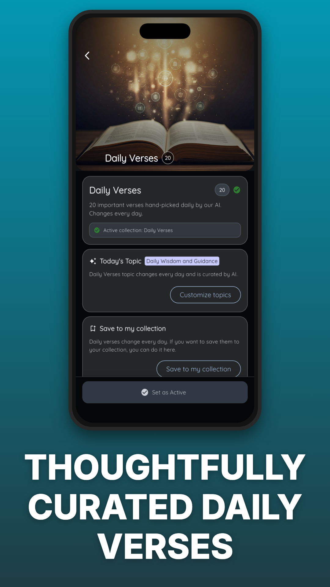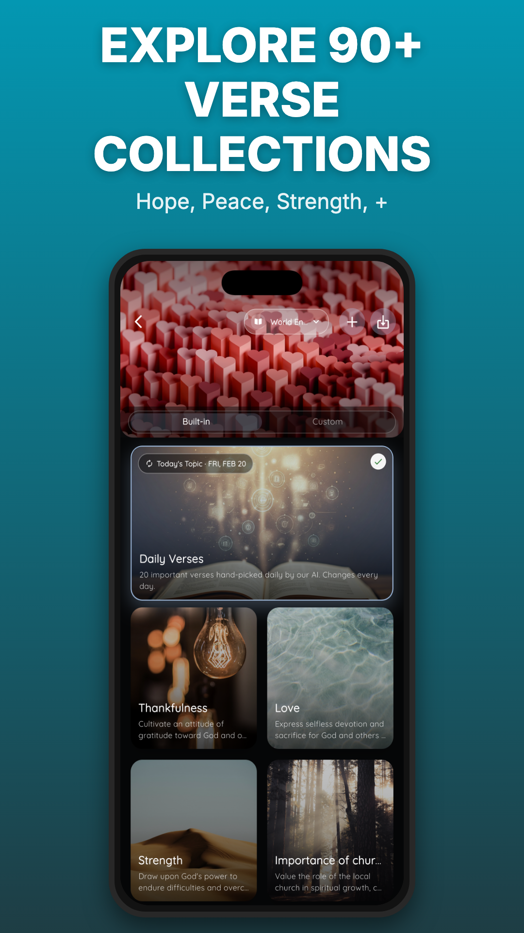 Save and revisit verses that speak to you. Over 50 verse themes available.