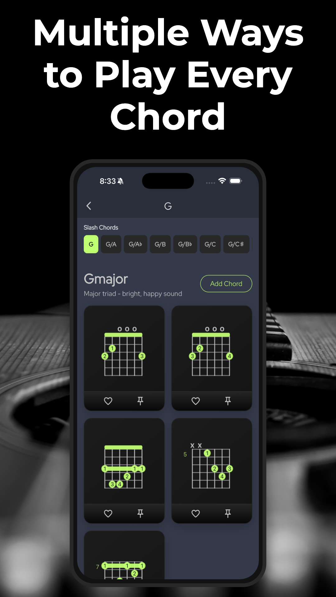 Find any chord intuitively with multiple style variations and clear fingerings.